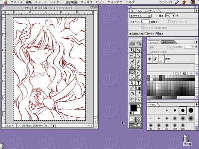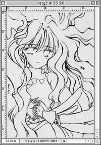 てきとうな大きさのコピー用紙に下書きします。私はA5サイズが定番。 それを清書して(最近はふでペン。三菱の親子ふでペンがお気に)、スキャンします。 使用スキャナは、エプソンのGT-8000!何!まっくんで動くハズがないと!?ハイ。スキャンは旧Macはセントリス650のせんちゃんでやってます。 白黒写真で解像度は240。72パーセントで取り込んでます。で、MOでまっくんに移してみました(写真)。 |
