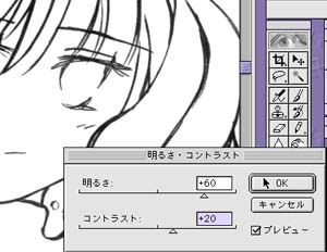 とりあえずこの灰色の画像をどうにかしなければなりません。 イメージの色調補正の明るさ・コントラストでスライダーをぐぐいと動かしてお好みの白さと黒さにいたしましょう。すっきり。 |