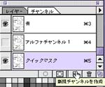 3.ツールのしたの日本国旗みたいな(反転している場合はダブルクリックで選択範囲を色付き表示されるようにしましょう)ボタンをクリックするとクイックマスクモードになります。全部赤やら青やらになりましたか? そしたら新規レイヤー上にペースト(コマンド+V)します。 チャンネルパレットを出すとそれが「クイックマスク」となっていますから新規作成のボタンにドラッグしてアルファチャンネルを作成します。 終わったらクイックマスクは解除してレイヤーも捨てちゃいましょう。後で使うんですー。 |