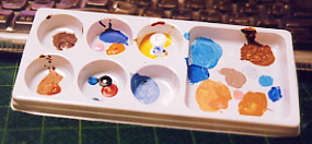 おつかれさまでしたー。 アクリル絵の具はリキテックスですが、パレットはやっぱり100均の使い捨て。 |