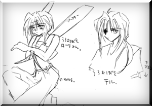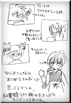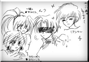 奈月マスターがスケブを持ってきました。わーなんか描いてあるー。え、これルメルトだー!!三等身だけど。これは別の紙に描いてあって、CG用だとか。ここらあたりからCG話になって、的場さんから「とってもためになるかんたんぺインター講座」を聞いたんですが。それも覚えてたらの話さ。そういや「イラストレーター話」も聞きました。的場さんはコスモでも(他社PBMはこれから……私)お仕事されてるらしい。そこらへんの採用話とかいろいろ〜。ソフトの話じゃないぞ。