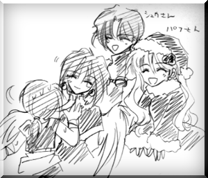 その直後に日柳さんを捕まえ、さらに旅館を出たところであるとさんを捕獲、無理にお願いしてスケブを描いていただきました。ここで青木さんと些細な打ち合わせ。ライセ3で兄妹やるのです〜。ファミリーネーム、「イーオスローズ」でやりましょー!